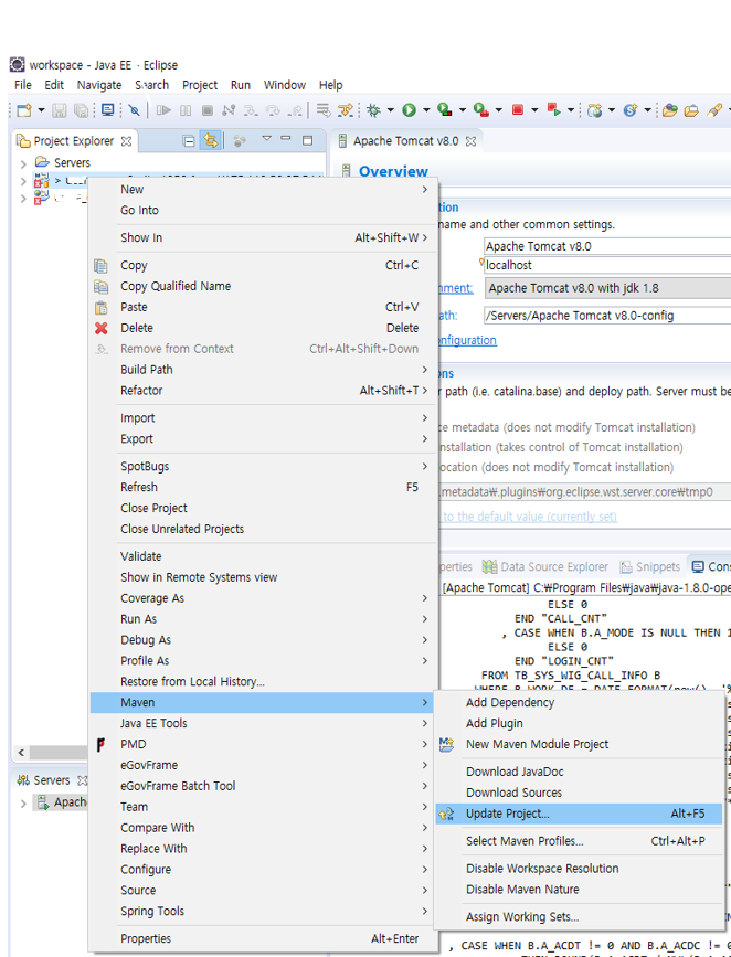 | ์ดํด๋ฆฝ์ค -> ์คํํ๊ณ ์ ํ๋ ํ๋ก์ ํธ ๋ง์ฐ์ค ์ค๋ฅธ์ชฝ -> Maven -> Update Project ... |