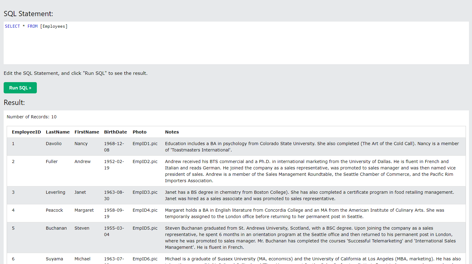 | EmployeeID ์ง์ID LastName ์ด๋ฆ FirstName ์ฑ BirthDate ์๋ ์์ผ Photo ์ด๋ฏธ์ง Notes ์ ๋ณด |