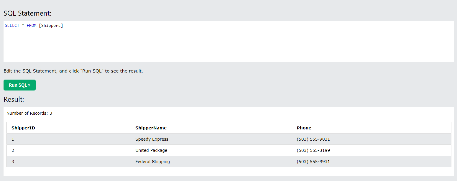 ์ฒด ID ShipperName ๋ฐฐ์ก์ ์ฒด ์ด๋ฆ Phone์ ํ๋ฒํธ |