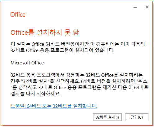 ์ด ์ค์น๋ Office 64๋นํธ ๋ฒ์ ์ฉ์ด์ง๋ง ์ด ์ปดํจํฐ์๋ ์ด๋ฏธ ๋ค์์ 32๋นํธ Office ์์ฉ ํ๋ก๊ทธ๋จ์ด ์ค์น๋์ด ์์ต๋๋ค.