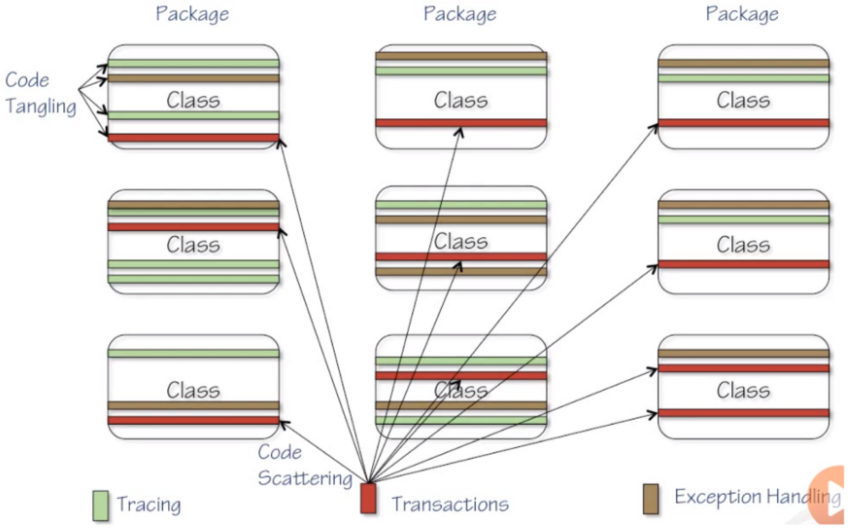 - Code Tangling: Each class, each method contains Tracing, Transactions, and Exception Handling, and also Business Logic. In a tangled code it is often hard to see what is actually going on in a method.