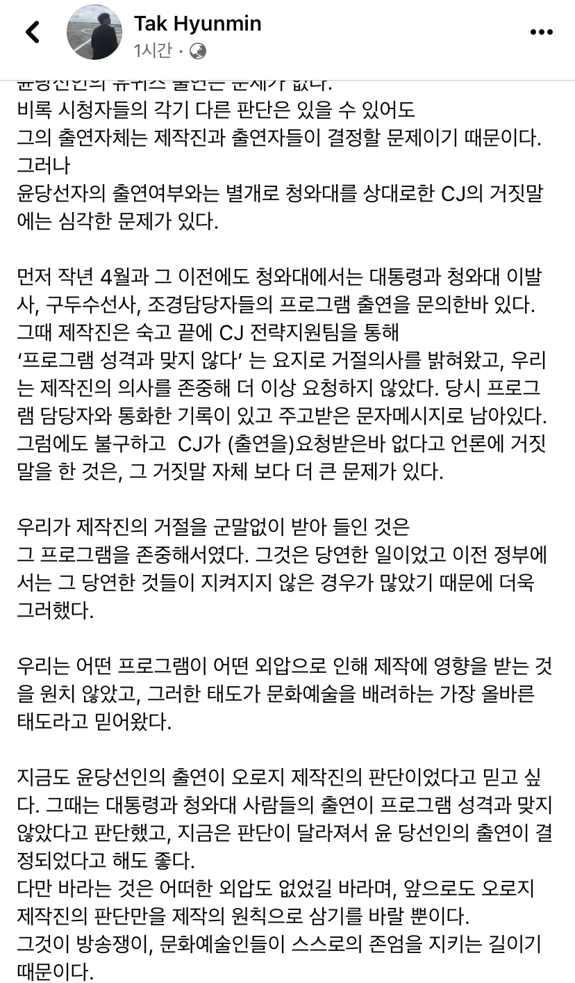 ํํ๋ฏผ SNS "CJ์ ๊ฑฐ์ง๋ง"
