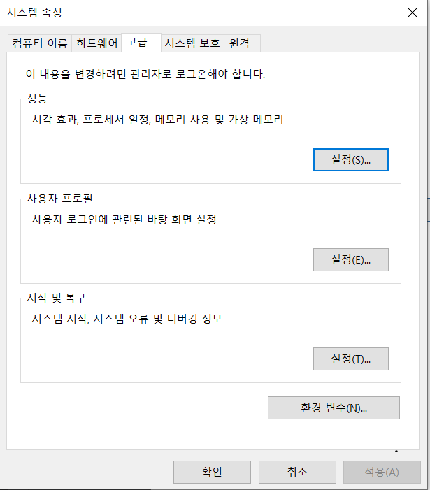 ๋ค์์ ์ ๋ ฅํด์ค๋ค. -> sysdm.cpl