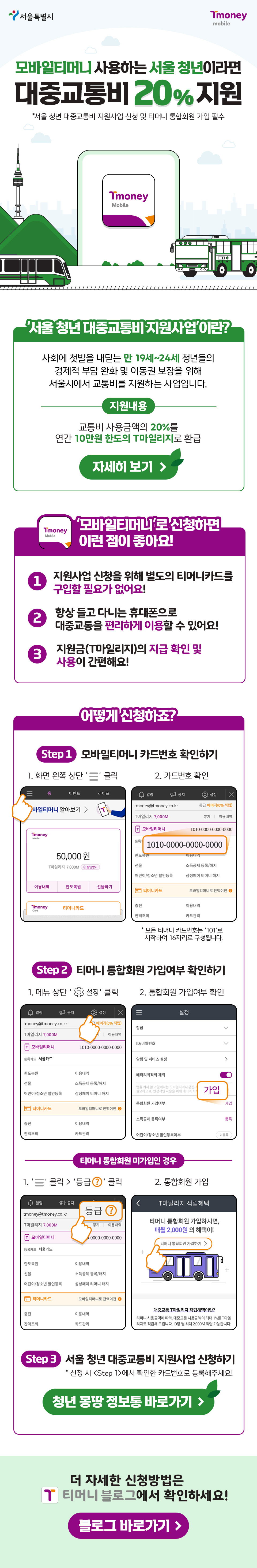 2. ‘ํฐ๋จธ๋์นด๋&ํ์ด’ ํํ์ด์ง(pay.tmoney.co.kr) ์ ์ ํ [๋ก๊ทธ์ธ] – [๋์ ํฐ๋จธ๋] – [๋ฑ๋ก๋ ์นด๋ ํํฉ] – [์ ๊ท์นด๋๋ฑ๋ก] - ์นด๋๋ฒํธ(16์๋ฆฌ) ์ ๋ ฅ ํ, ๋ง์ผ๋ฆฌ์ง ์๋น์ค ๋ฑ๋ก ์ฒดํฌ ํ ์ ์ฅ์ ๋๋ฅด์๋ฉด ๋ฑ๋ก์ด ์๋ฃ๋ฉ๋๋ค.