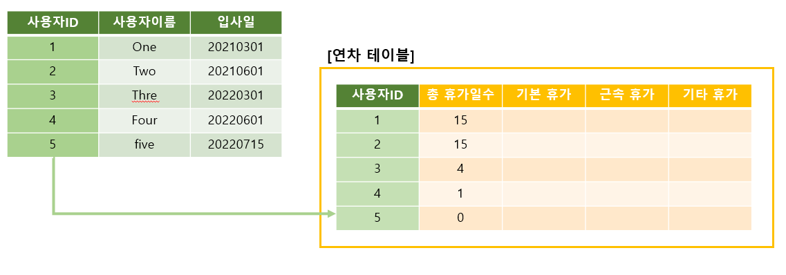 [์ฌ์ฉ์ ํ ์ด๋ธ]์ '์ ์ฌ์ผ'์ ๊ตฌ๋ถํ์ฌ [์ฐ์ฐจ ํ ์ด๋ธ]์ 'ํด๊ฐ ์ผ์'์ ๋ฃ์ด์ค์ผ ํ๋ค.