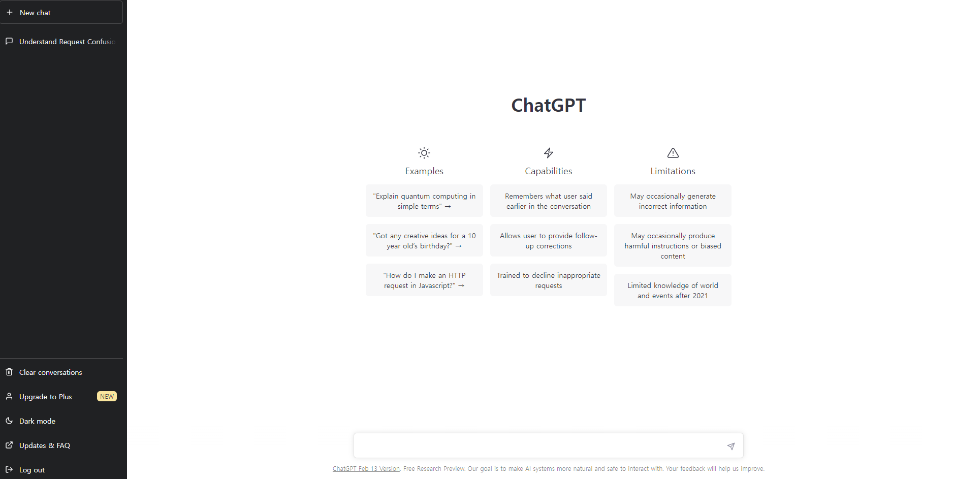 ์ ์ด์ ChatGPT๋ฅผ ํ์ฉํ ์ ์๊ฒ ๋์์ต๋๋ค! ๊ฐ์ด๋ฐ ์๋ ๋ถ๋ถ์ ์๋ Input Box์ ์ง๋ฌธ์ ์ ๋ ฅํด์ฃผ์๋ฉด ๋ฉ๋๋ค.
