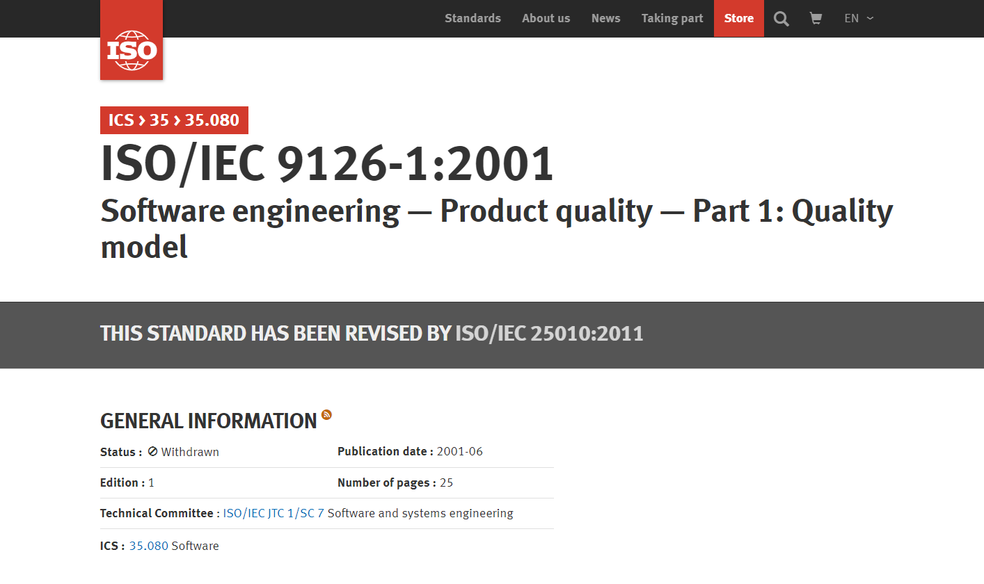μννΈμ¨μ΄ κ°λ°μ μμ΄ μ ν νμ§ νμ€μ λν λ¬ΈμμΈλ°, μ¬κΈ°μ ISO/IEC 25010μΌλ‘ νμ₯λμμμ μ μ μλ€. μ¬μ©μ± νκ°μ κΈ°λ°μ΄ λλ νμ€ λ¬Έμλ‘ μ΄ λκ°μ§κ° κ°μ₯ μμ£Ό μΈκΈλλ μ΄μ κ° μ΄κ²μ΄λ€. νμ¬ μ΄μ λ²μ μΈ ISO/IEC 9126μ Withdrawn μνλ‘, μ΅μ λ²μ μΈ SO/IEC 25010 νμ΄μ§λ‘ κ°λ³΄μ. ν νμ΄μ§μμ μ€ν¬λ‘€μ λ΄λ¦¬λ©΄ μ λ²μ μΌλ‘ λ°λ‘κ°κΈ°ν μ μλ λ²νΌμ΄ μλ€.
