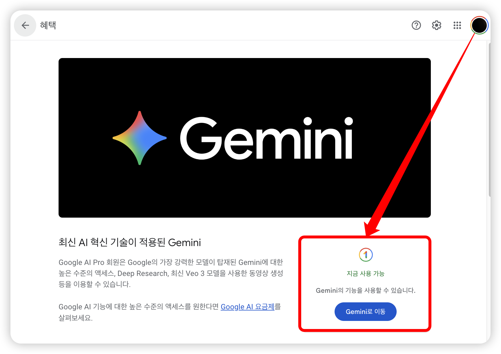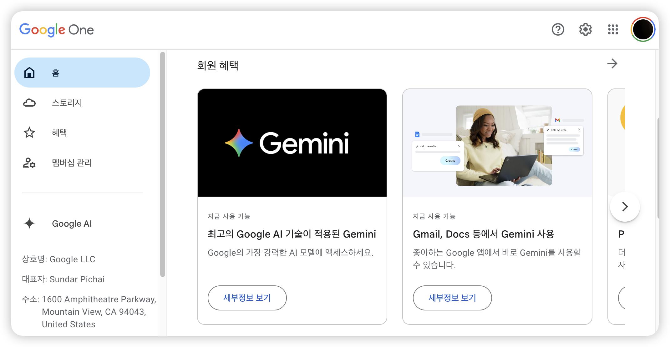 - Google One(๋๋ Gemini ๊ตฌ๋ ํ์ด์ง)์์ ํํ์ด ๋ถ์๋์ง ํ์ธํ๋ฉด ๋ฉ๋๋ค.