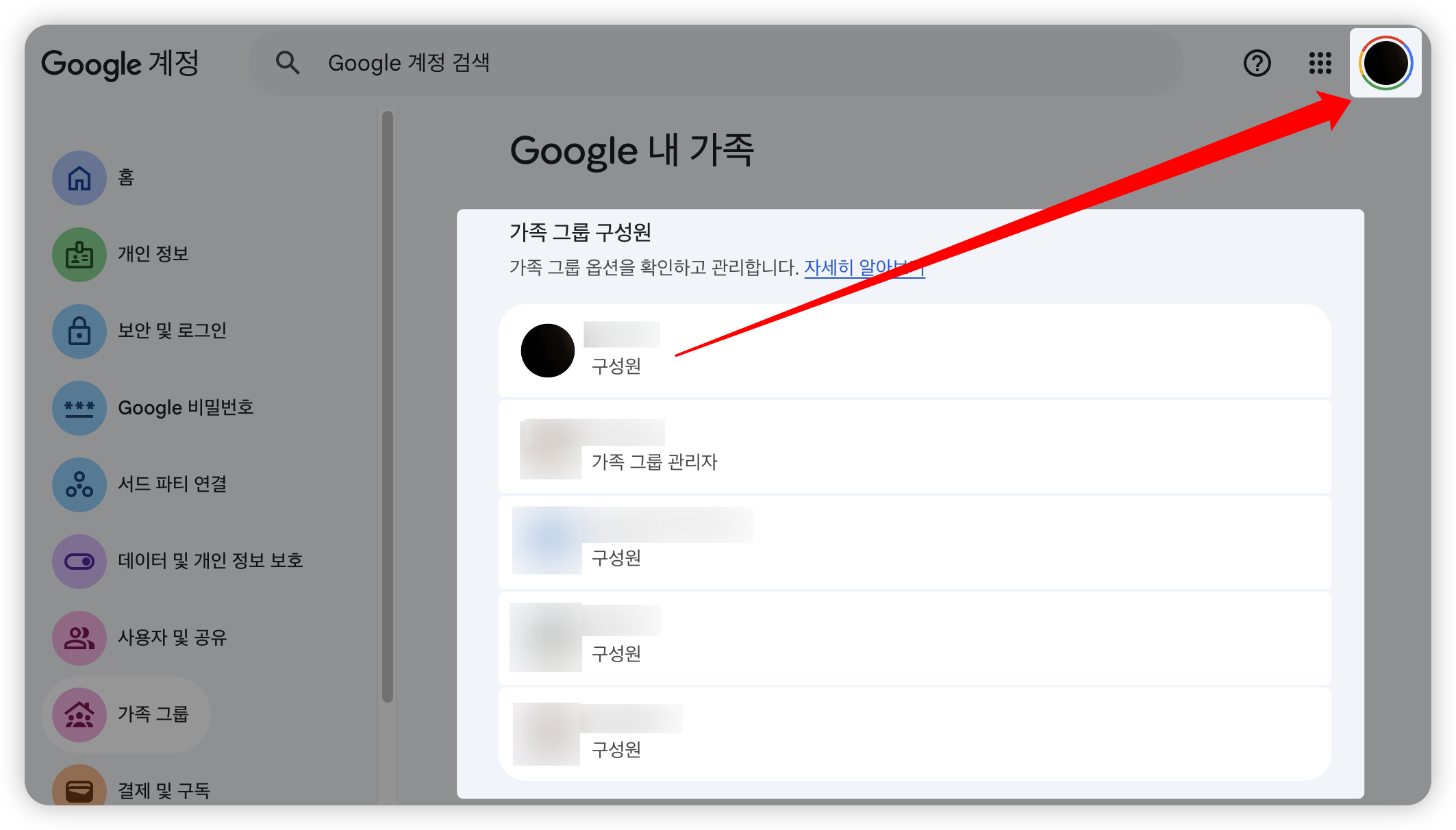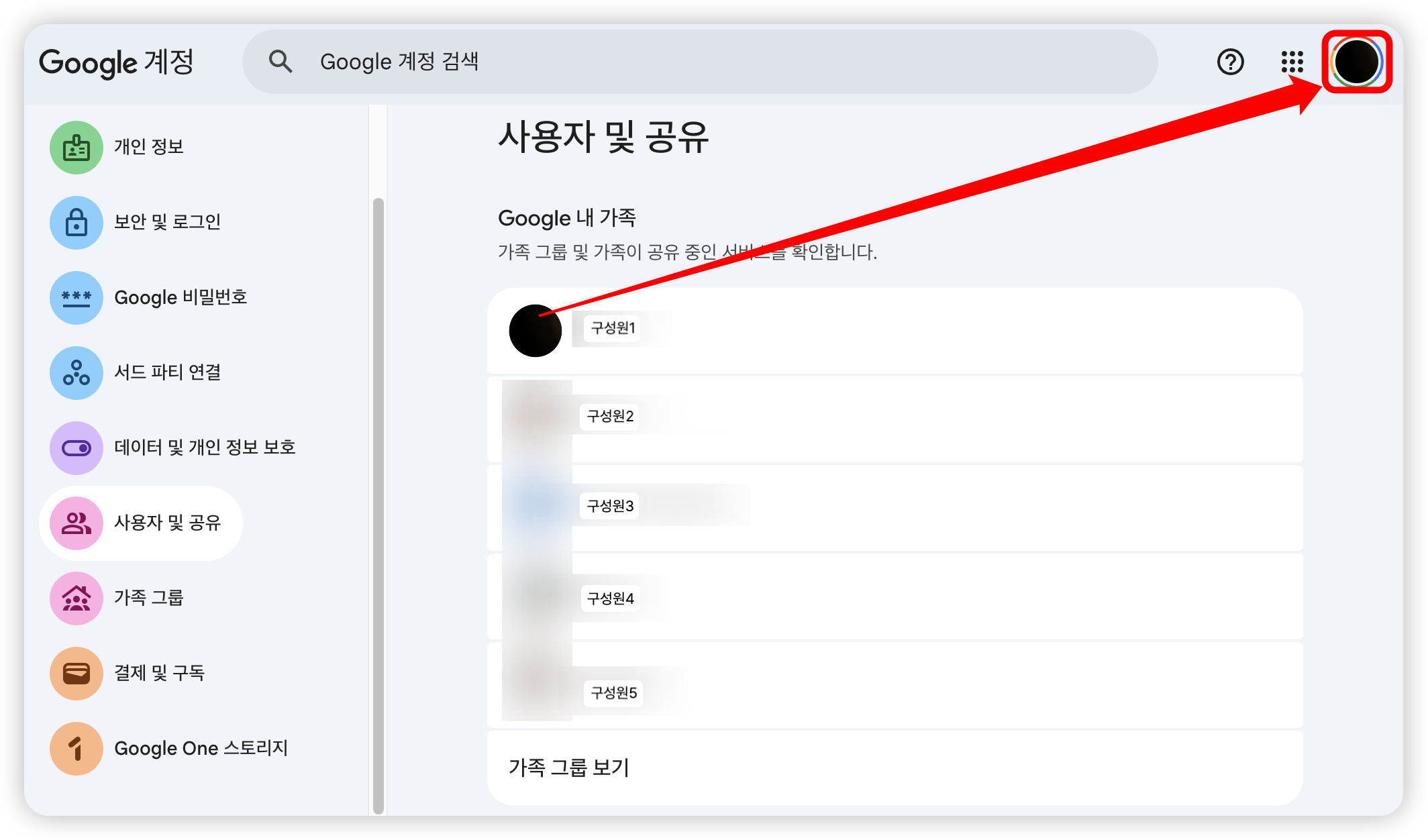- ํ๋กํ ์ฌ์ง ์ฃผ๋ณ์ ๊ตฌ๊ธ ์ปฌ๋ฌ ํ ๋๋ฆฌ๊ฐ ์ ์ฉ๋์์ผ๋ฉด ๊ฐ์กฑ ๊ตฌ์ฑ์์ ์ถ๊ฐ๋ ๊ฑฐ์์.