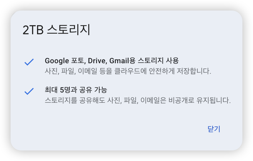 ์ด ๋, ์์ ์ ํ ๊ฒ์ฒ๋ผ ์ ๋ฏธ๋์ด ์ฌ์ฉ์ ๊ณต์ ํ๋ ๊ฒ ๋ฟ๋ง ์๋๋ผ ๋๋ผ์ด๋ธ, Gmail ๋ฑ ๊ตฌ๊ธ์์ ์ ๊ณตํ๋ ๋ชจ๋ ์ ์ฅ ๊ธฐ๋ฅ 2TB๋ฅผ ๊ณต์ ํด์ ์ฐ๋ ๊ฑด๋ฐ์!