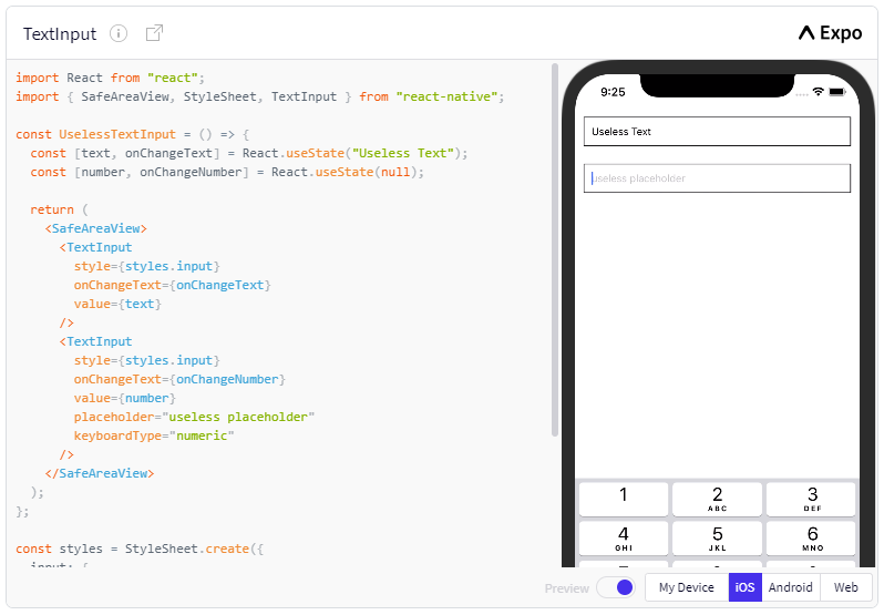 A foundational component for inputting text into the app via a keyboard. Props provide configurability for several features, such as auto-correction, auto-capitalization, placeholder text, and different keyboard types, such as a numeric keypad.