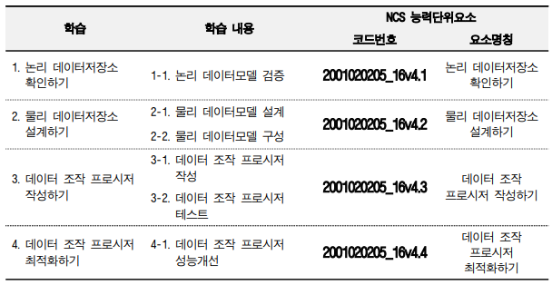 ๋ฐ์ดํฐ ๋ฐ ์ด๋ค ๊ฐ์ ์ฐ๊ด์ฑ๊ณผ ์ ์ฝ์กฐ๊ฑด์ ์๋ณํ์ฌ ๋ ผ๋ฆฌ์ ์ผ๋ก ์กฐ์งํํ๊ณ , SW์ํคํ ์ฒ์ ๊ธฐ์ ๋ ๋ฐ์ดํฐ ์ ์ฅ์์ ์กฐ์งํ๋ ๋จ์์ ๋ฐ์ดํฐ๊ฐ ์ ์ฅ๋ ์ต์ ํ๋ ๋ฌผ๋ฆฌ์ ๊ณต๊ฐ์ ๊ตฌ์ฑํ๊ณ ๋ฐ์ดํฐ ์กฐ์์ธ์ด๋ฅผ ์ด์ฉํ์ฌ ๋ฐ์ดํฐ ์ ์ถ๋ ฅ์ ๊ตฌํํ ์ ์๋ค.