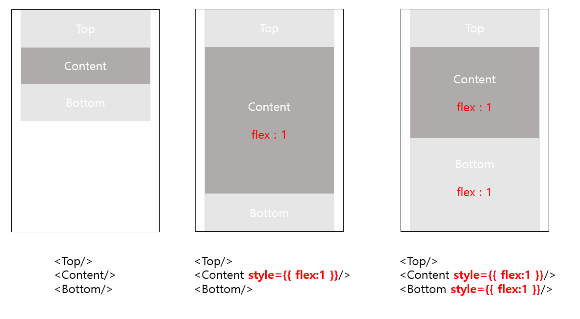 ๊ทธ๋ผ ๋ค์ Bottom์๋ ๊ฐ์ด flex:1 ์์ฑ์ ์ฃผ๊ฒ ๋๋ฉด, Contents์ 1:1 ๋น์จ๋ก ๋ถ๋ชจ ์ปดํฌ๋ํธ๋ฅผ ์ฑ์ฐ๊ฒ ๋๋ค.