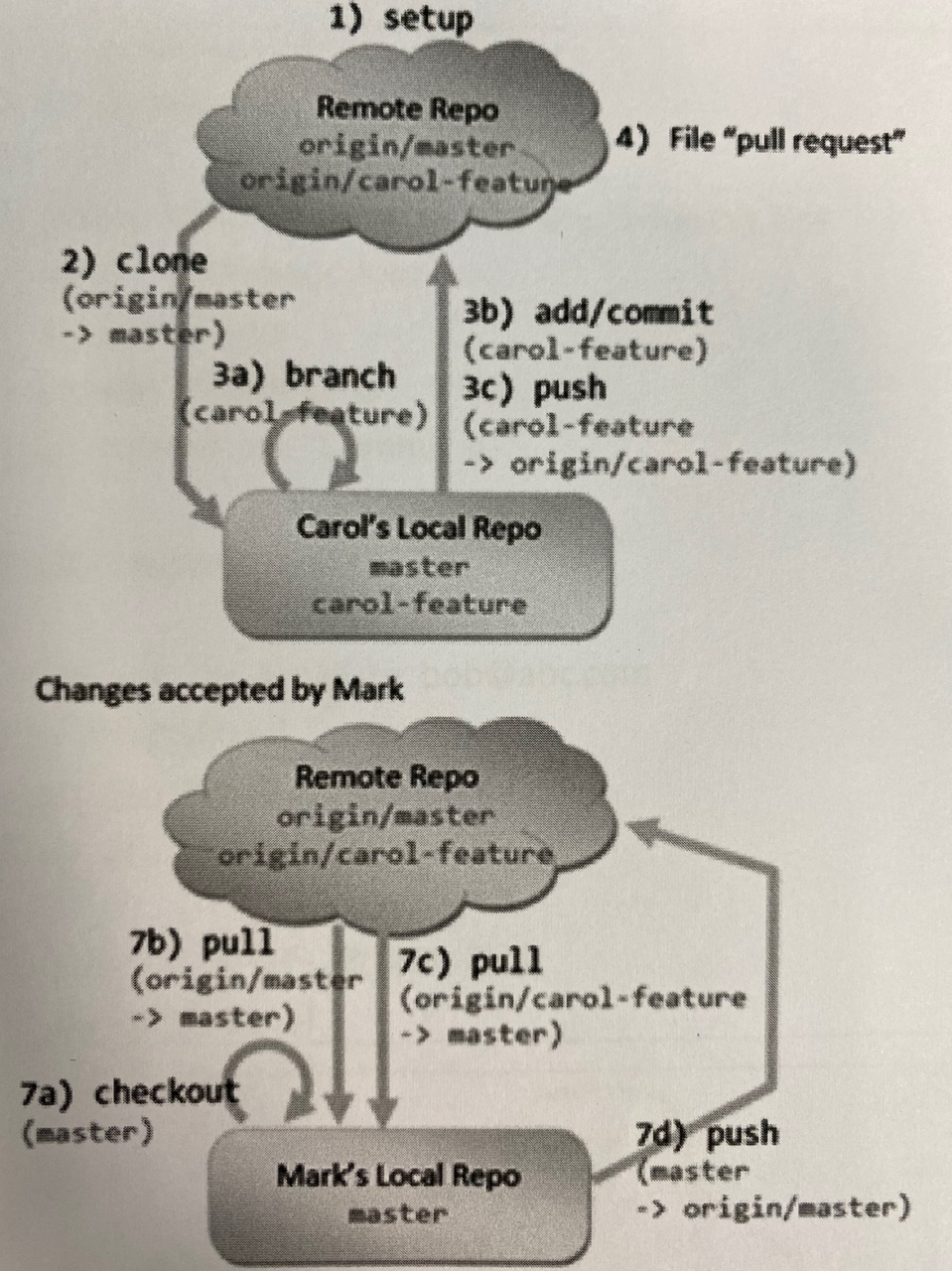 κ°λ°μCarolμ μμ μ λΈλμΉμμ μμ μ 컀λ°ν ν Markμκ² Pull reqluestλ₯Ό 보λΈλ€. ν 리λμΈ Markλ μ½λλ₯Ό 리뷰ν ν, μλ½νκ³ μ ν΅ν© λ²μ (pullμ 2κ° λ°μ)μ μ격 μ μ₯μμ μ μ₯νλ€.