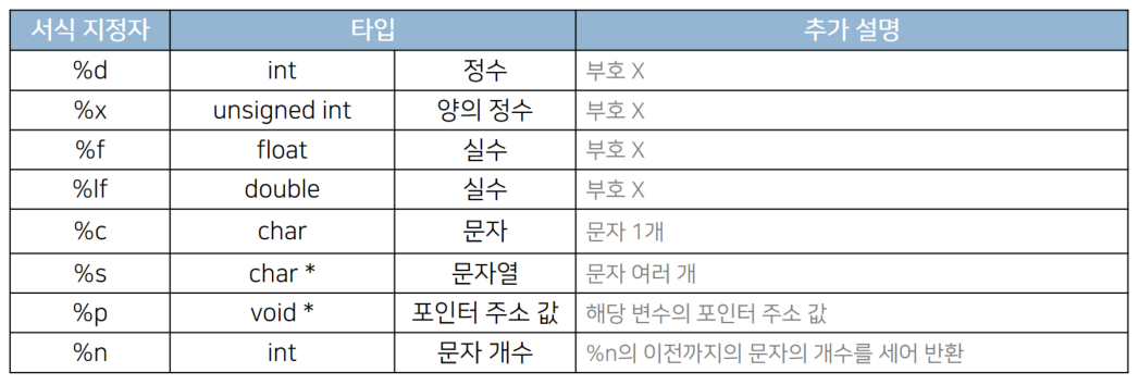 ์๋ฅผ ๋ค์ด int ํ์ ๋ณ์๋ฅผ ์ถ๋ ฅํ๋ค๋ฉด %d๋ฅผ ์ฌ์ฉํ๋ ์์ด๋ค.
