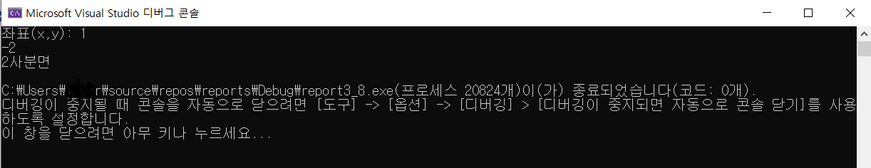 (x, y) ์ขํ๋ฅผ ์ ๋ ฅ๋ฐ์์ ์ขํ๊ฐ ์ํ๋ ์ฌ๋ถ๋ฉด์ ํ๋ฉด์ ์ถ๋ ฅํ๋ ํ๋ก๊ทธ๋จ์ ์์ฑํ๋ผ.
