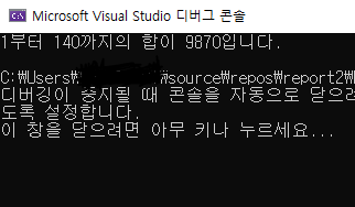 1๋ถํฐ 140๊น์ง์ ํฉ์ด 9870์ผ๋ก ์ ์ถ๋ ฅ๋๋ ๊ฒ์ ํ์ธํ ์ ์๋ค. ์ฃผ์ด์ง ํํธ ๋๋ก ์์ฑํ๋ค๋ฉด ์ฌ์ด ๋ฌธ์ ์ด๋ค.